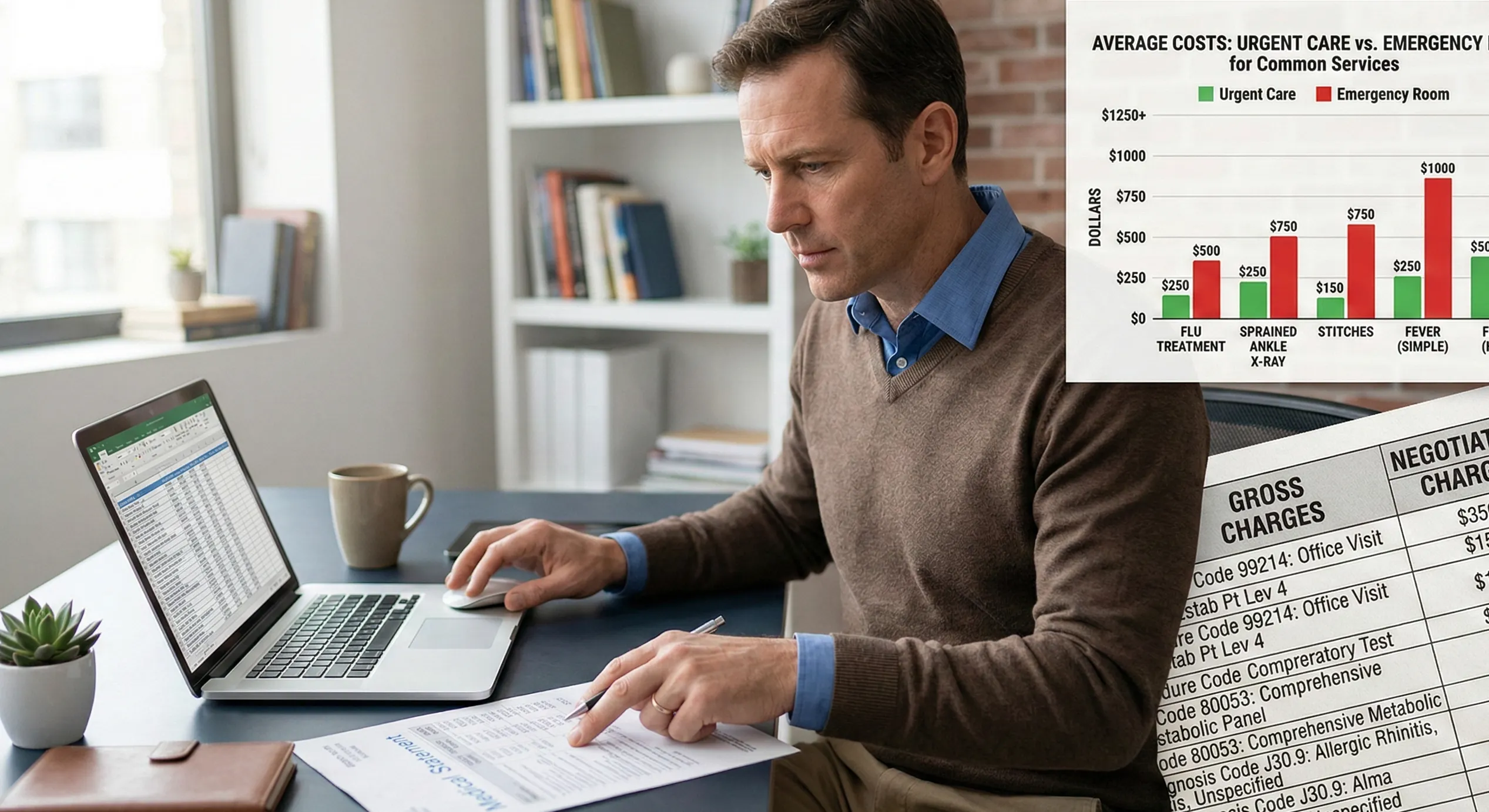 A photorealistic editorial scene of a man in a brown v-neck sweater and blue shirt sitting at a desk, illuminated by soft natural light from a side window. He is focused on a laptop displaying a spreadsheet. The composition includes two informative graphic overlays: a bar chart comparing "Urgent Care vs. Emergency Room" costs with vibrant green and red bars, and a detailed medical statement showing columns for "Gross Charges" and "Negotiated Charges."